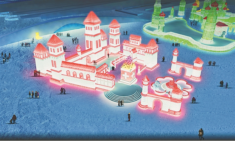 以北京故宫紫禁城正门为原型的五凤传奇、以德国柏林大教堂为原型的单车城堡、以美国盐湖城犹他圣殿为原型的登月城堡、以俄罗斯克里姆林宫为原型的童话城堡、……效果图显示,融合了众多中西方建筑艺术元素的冰雪城堡,各具特色、各有风情。