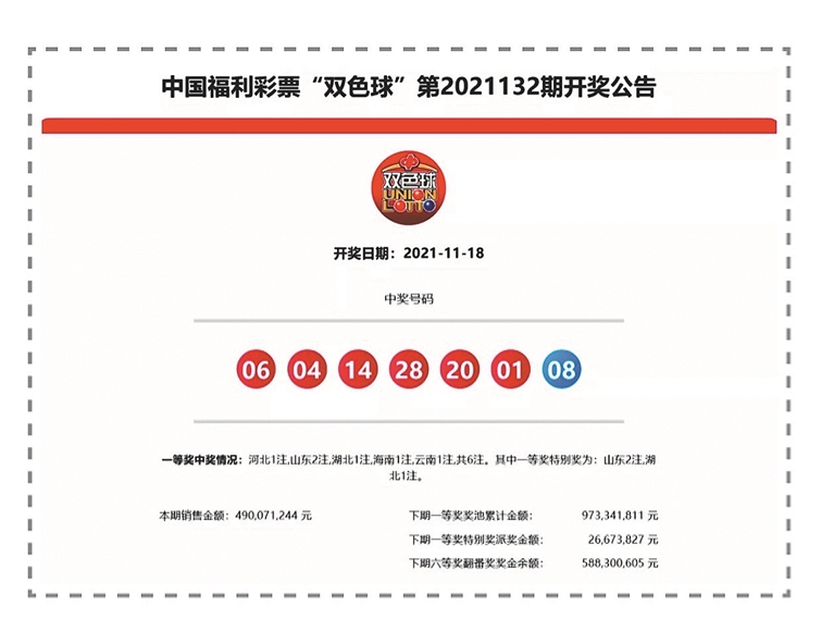 本期双色球全国销量为4.9亿元,为国家筹集公益金1.76亿元。计奖后,双色球奖池金额为9.73亿元。下期一等奖特别奖派奖金额26673827元,六等奖翻番奖奖金余额588300605元。