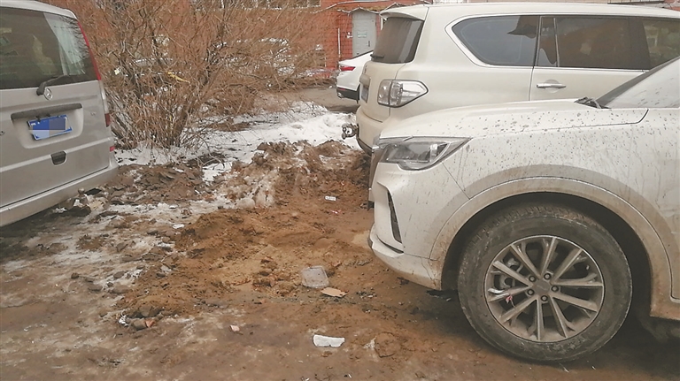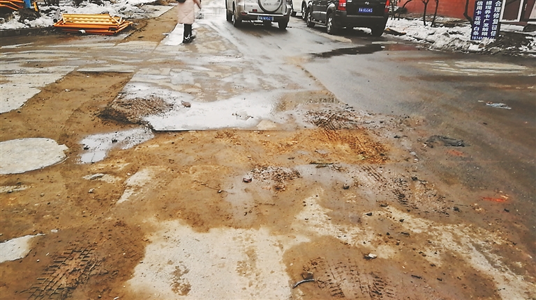 “一个多月了,路面没填平,有小坑还有土在路边堆着。前两天下雨下雪,现在坑里都是稀泥和冰。”黄女士说,居民现在走路都要多加小心,不然就会弄一身泥。记者此后来到健康家园发现,走进小区就能看到地上长条状的“坑”,里面虽然有填充材料,但并不坚硬,加上雨雪融化,材料被浸湿,一踩就能踩出脚印;继续向前走还能看到路边的大土堆,四周有停靠的私家车,围挡板内有一处施工点。