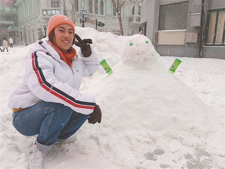 “我大学是在哈尔滨上的,后来出国读书,再也没见过雪。”李女士告诉记者,“我是山东潍坊人,回家也看不见像哈尔滨这么大的雪,所以我就想着再来哈尔滨玩几天。”在中央大街随便走走,“我发现雪堆有人堆了个形状,但不太明显,所以我就想着堆成一个好看的小雪人。”李女士蹲在雪堆旁20多分钟,用手轻轻拍出一个圆圆的脑袋,再画出一个下半身的形状,捡了两个饮料瓶当做雪人的手臂,瓶盖当做雪人的眼睛。李女士表示看见哈尔滨的雪,才觉得冬天更加完整了。