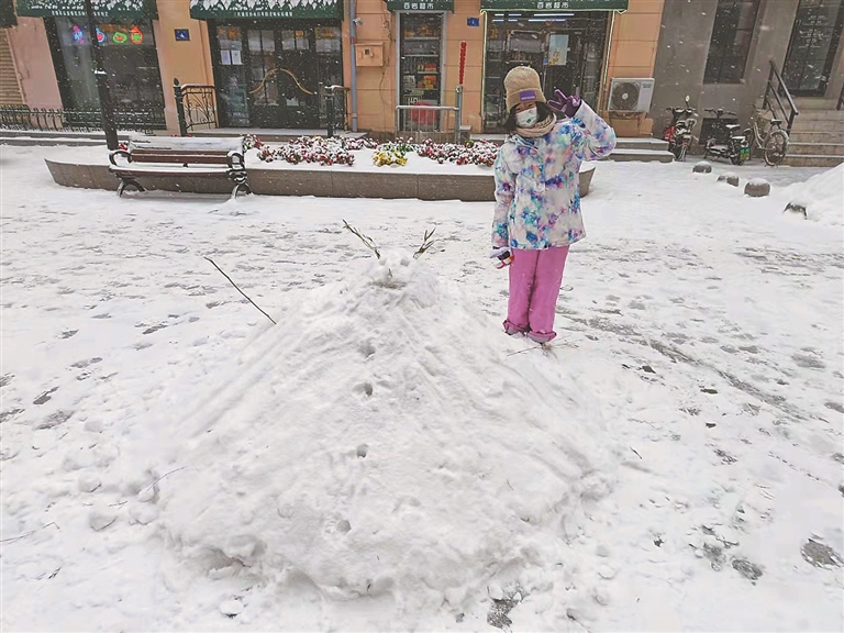 生活报讯 (实习生李雨桐 邢轩祎 记者李丹文/摄) 22日上午,哈市夏先生指导女儿小晗如何制作出美丽的雪人。小晗半趴在雪人身上,用双手给雪人拍掉多余的雪,再用一根小木棍把雪人的眼睛画出来。因为没带纽扣,所以只能用手给雪人画出扣子的形状。“这个雪堆是早上清完雪堆在这儿的,看着刚好就特别像一个大雪人的形状。我们把雪人的头和下半身画出来,这样就更像啦。”小晗十分开心地跟记者说道。