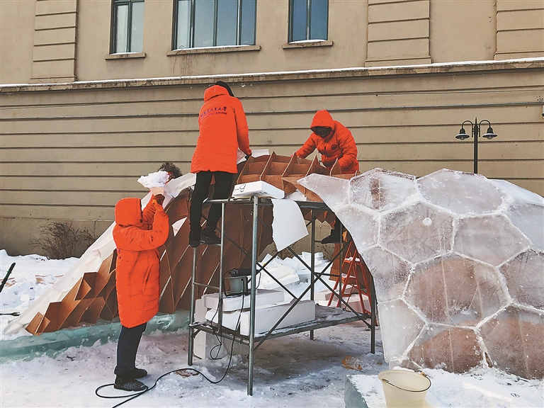 此次入选的另一案例,是《面向冰雪建造的计算性设计与应用实践》。哈尔滨工业大学互动媒体设计与装备服务创新文化和旅游部重点实验室的研究人员介绍说,要想让一块块冰砖严丝合缝地搭在一起还保证不塌,首先就要从冰砖上下功夫。在计算机精准的计算下,机械臂沿着投影线精准地切割出六边形模具,再将灌满水的模具放在哈尔滨零下20多摄氏度的“天然大冰箱”里冻上10个小时,几乎在一夜之间全部冰砖就冻好了。一块块冰砖按顺序砌筑在经过设计优化过的支撑模板上,达到整体受力的水平平衡和垂直平衡后,支撑模板便可拆除,不需要任何粘结剂,冰块在相互挤压的作用下形成一座优美、稳固的冰壳建筑。