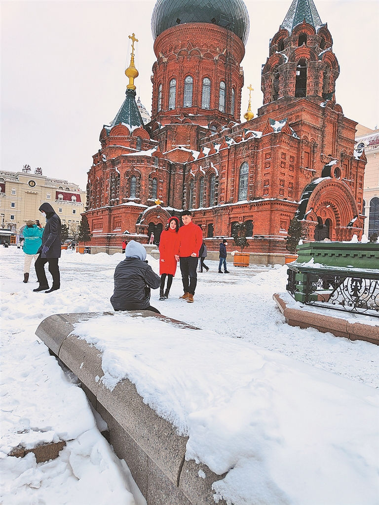 23日,在松花江江边和索菲亚教堂门前,不少游客和本地市民纷纷在热门景点处拍写真,也有很多市民拿照相机、手机为同伴拍照。在索菲亚教堂门前,生活报记者看到一位摄影师正为一对情侣拍写真照。随后,一位身穿粉色毛绒外套、白色短裙的女士吸引了记者的注意,她也在拍摄写真。通过采访,生活报记者了解到,这位曾女士刚从深圳来到哈尔滨,“听说东北的雪洁白如玉,特意看着天气预报来东北看看雪,感受一下东北的冰雪文化。”曾女士说。
