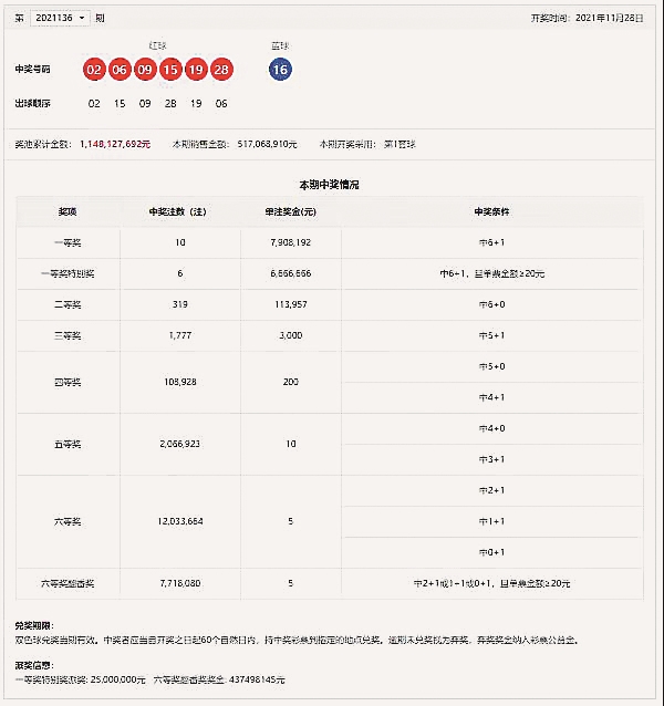 按照派奖规则,本期计奖结束后,双色球12亿元大派奖活动还剩14期,一等奖特别奖剩余派奖金额为3.50亿多元,六等奖翻番奖剩余派奖金额为4.37亿多元。