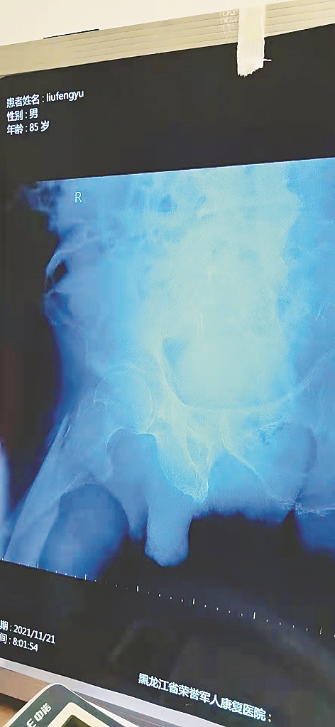马先生表示,事发后护养院工作人员给老人家属发的X光片显示,老人股骨骨折。事发后,老人家属多次向有关部门反映,护养院工作人员给家属了一份情况说明——关于“意外骨折事件家属索要处理意见的答复”中写道:“11月21日7时许,早饭前在工作人员查房过程中发现老人右腿疑似背折症状,8点15分转入医院相关科室进行相关检查,影像结果经医生与哈尔滨市第五医院骨科专家查阅后所得结果为,老人右侧股骨闭合性骨折并伴有重度骨质疏松(骨小梁消失),同时院方针对老人骨折的原因,对其护理人员与同室居住其他老人或有可能了解详情的所有人员进行了相关调查,当日房间内并无异常,老人没有下过床,也未与任何人产生过任何争执,老人右腿无任何外伤,综合骨科专家对其斜性骨折接口分析,调查所得结果指向疑似骨折原因为:20日18时许在护理人员为老人更换衣物时造成此次骨折意外。”马先生表示,这份情况说明并没有落款单位和公章。