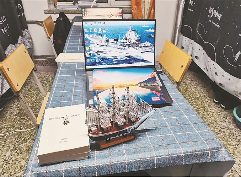 走进九公寓622寝室,首先映入眼帘的是“航行”在蓝色桌布上的一个船模,这个船模是寝室的四个小伙伴利用课余时间手工拼制的。寝室的墙上张贴着中国海军的战舰图片,书桌上随处可见船舶动力相关的书籍。寝室成员高志旭、杜昊玮、胡书豪、曹智远有一个共同点:心系船海,他们希望以自己的学识促进中国船舶的发展。