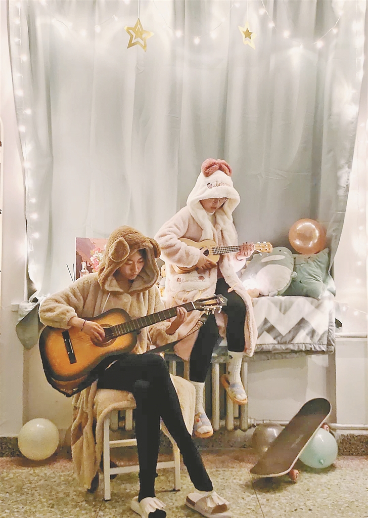 这个寝室的小姐妹们非常注重卫生,从开学到现在一直坚持“每天一小扫,每周一大扫”。“文艺范儿”的四姐妹寝室内有着各种各样的插花、壁纸和闪烁的彩灯,她们也会在寝室进行伴奏合唱、对棋博弈等活动。