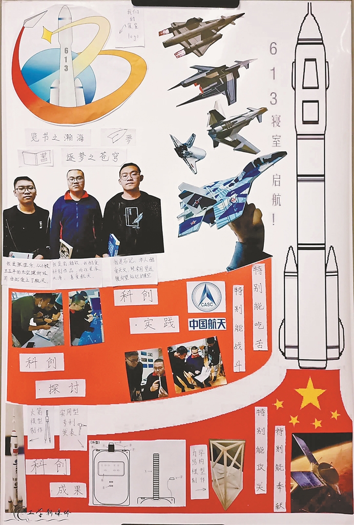 来自十三公寓613寝室的张佳乐、俞瀚钦、石记将自己的寝室文化总结为两点:航天文化与科创文化。他们寝室不但有许多从图书馆借阅的航空航天技术书籍,还有许多他们自己设计的手稿与图纸。基于对科创的热爱,寝室成员会使用模拟程序来合作设计新颖的飞行器,也会围绕未来技术进行讨论。课余时间他们参加了相同的科创社团,从开学至今已申报了“智能太空食品袋与自动食物装填加热清洁装置”“多用途模块化可变型仿生飞行器”2个专利。