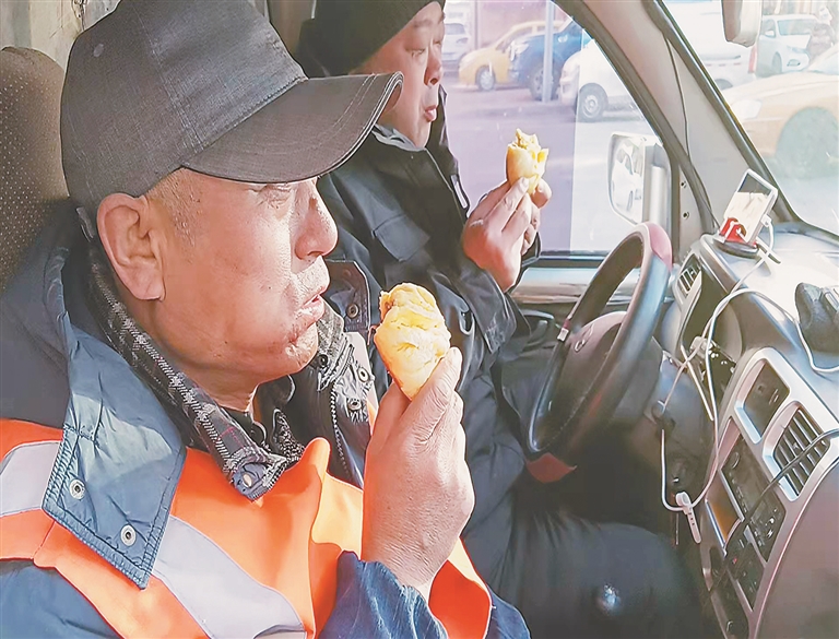 11点,两人坐在车上吃起了早上买来、已经冰凉的包子。李松、刘彦奎说,虽然节日期间不休息,但是看到整洁的卫生环境和大家其乐融融地在一起团圆过节,他们就觉得工作是有意义的,没白干。吃完凉包子,两人顾不上喝一口水,又开着播放起宣传语的收集车开启了循环收集工作。