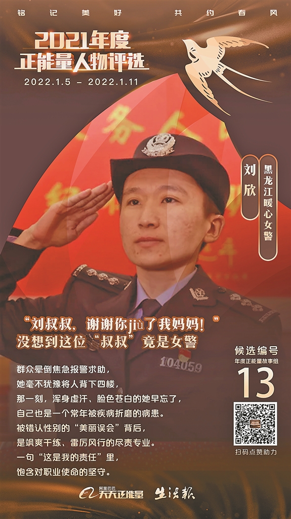 生活报讯 (记者李丹) 2021年12月底,阿里巴巴天天正能量联合本报及全国近百家主流媒体,启动了2021年度正能量人物评选,面向全社会征集候选案例。连日来,经过广大网友和各地媒体推荐,全国100组候选案例已经出炉,本报推荐的龙江女警刘欣成功入围候选。1月5日0时,评选投票将正式拉开帷幕,一起为他们点赞助力,让黑龙江正能量在新的一年绽放更耀眼的光芒。