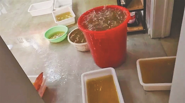 5日,记者来到大成街154号,发现此处地下室是一家艺术学校,刘大爷是这里的房主。记者进到屋内时,地面上全是水,还放着大大小小的桶和水盆用来接水,黄色的水不断从天棚上流下来,刘大爷不停地把桶里的水倒进厕所,但没过多一会儿,桶又满了。屋内即便戴着口罩,也能闻到一股臭味。刘大爷说:“这些水都是下水,可臭了。”