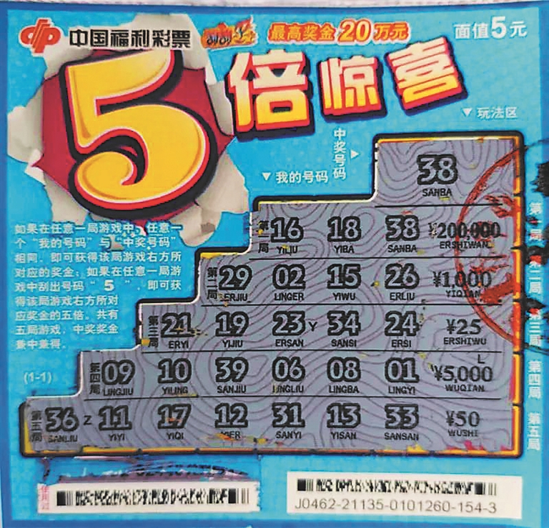 中奖当天,小张吃过午饭后便来到家附近的站点购彩。他先是买了5张最喜欢的“富贵有余”,中了10元钱,觉得自己手气不错,便用中奖彩票换了2张“5倍惊喜”继续刮。当他刮开第二张彩票的“中奖号码”时,数字“38”出现在他眼前,随后他慢慢刮开第一行“我的号码”区域,当数字“38”出现时小张心里一喜:中奖了!他赶紧刮开与之对应的奖金区域,结果“200,000”字样顿时映入眼帘。