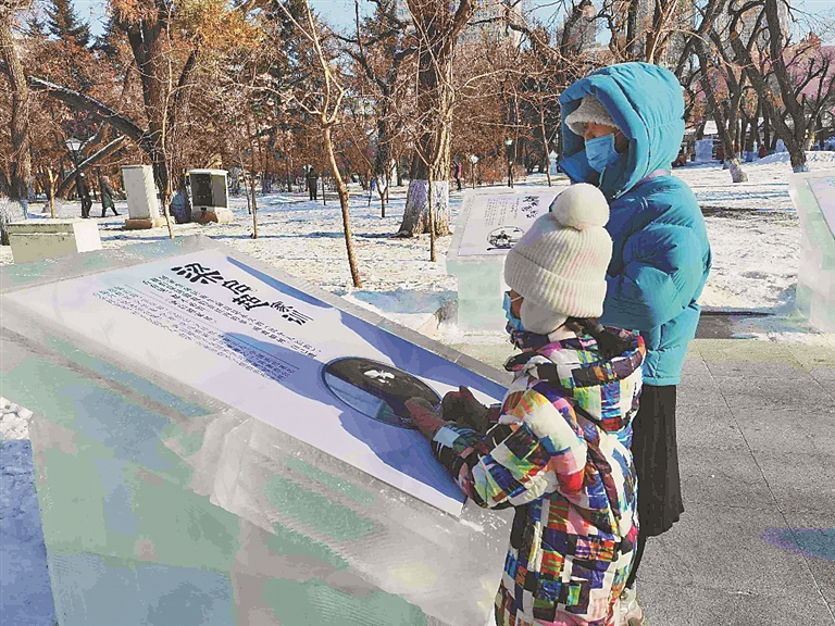 当日上午,记者在兆麟公园里转了一圈看到,这里的冰灯,秉承了冰灯艺术创立之初的传统风格,在此基础上,还融入了一些中国传统人物故事及名人名言。
