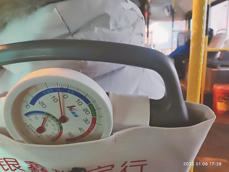 16时30分许,记者乘坐1线公交车,此时夜幕降临,是下班晚高峰。车上的乘客不少,车厢内温度却更低了,记者实测发现,温度竟然降到了-5℃。