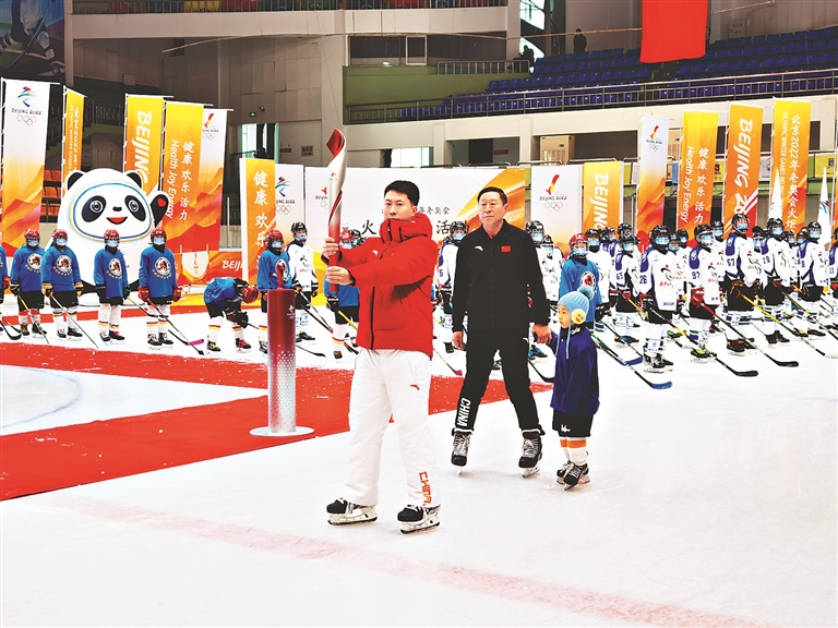 7日10时许,齐齐哈尔市冰球教练李文思手持北京冬奥火炬“飞扬”,与父亲、冰球老将李跃,儿子、龙沙小学冰球校队运动员李浩睿,祖孙三代冰球运动员共同上场,进行火炬展示。