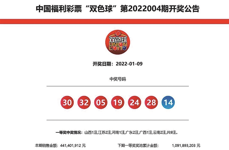 9日晚,中国福利彩票双色球游戏进行第2022004期开奖。本期双色球红球号码为05、19、24、28、30、32,蓝球号码为14。