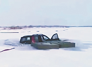 零下二三十度的夜里,救援人员跳进了冰水中,起初牵引绳挂载并不顺利,救援人员先后几次下水移除冰块,终于挂载成功。挂载好牵引绳后,其他队员迅速将木板插进水中,利用冰上救援支架,将被困车辆一点点地向岸边安全地带拖拽。经过近3小时的紧张救援,被困车辆于晚6时左右被成功打捞出水。