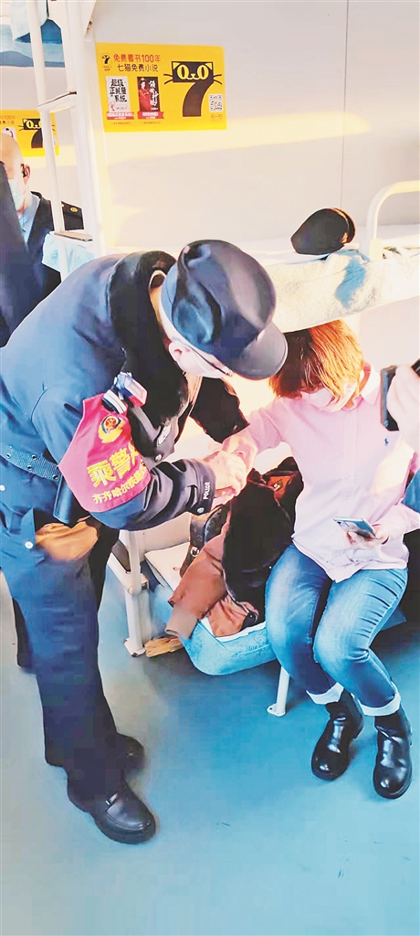 接报后,民警立即赶往现场,给其服用了速效救心丸并通过广播寻找医务人员。据王志强介绍,车上当时未找到医务人员,虽然服用了速效救心丸,但王女士仍然有呼吸困难、后背疼痛难耐等症状。于是,他立即对王女士进行按摩,5分钟后,王女士不适症状逐渐消失。在确认其无碍后,民警为其安排了卧铺休息。