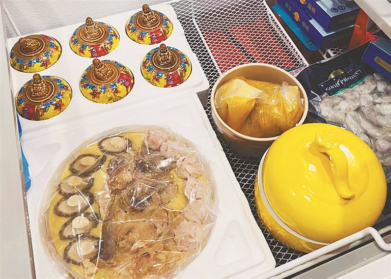 在一家海鲜店内记者看到,佛跳墙和大盆菜的包装基本分为两种:一种是透明塑封袋装的,另一种是小锅和小盆装的,更高档些的是若干个小罐包装的,每次每人食用一小罐正好。这两种菜的特点就是解冻后小火慢炖即可食用,无需再加调料。那种礼盒内直接带锅或盆的更是方便,将菜倒入锅内加热就行。