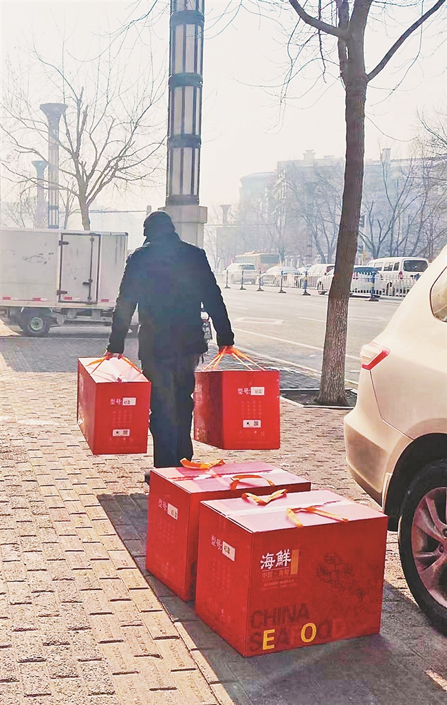 生活报讯 (实习生张瑞焓 记者梁晨文/摄)一年一度的新春佳节日益临近,走亲访友的同时当然少不了精美的礼品,其中海鲜大礼包不仅外观喜庆,里面的冻货也都高端大气,很受冰城市民的喜爱。19日,生活报记者来到哈尔滨市道里区安隆街与安升街交口附近走访发现,10余家海鲜店一家挨着一家,有的店门口摆放着各类海鲜大礼包,还有佛跳墙和大盆菜等新品,不时有顾客往车上搬运,一幅置办年货的热闹景象。