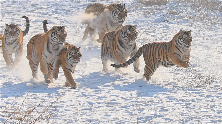 同日,距哈尔滨265公里外,完达山脉虎峰岭脚下,中国横道河子猫科动物饲养繁育中心,49只3岁虎正踏雪狂奔,在密林深处做野化训练;60多只东北虎正两两成双,在特别的虎舍里培养情感,期待它们虎年里生出爱情结晶。