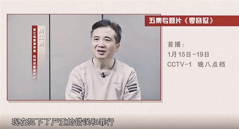 据《北京晚报》报道 20日昨晚,专题片《零容忍》第五集《永远在路上》播出,披露了浙江省委原常委、杭州市委原书记周江勇存在的家族式腐败问题。周健勇将哥哥的权力作为经商谈判的筹码,周江勇则是为弟弟的关联企业充当靠山。兄弟共同收受巨额贿赂,再投入家族企业作为资本。