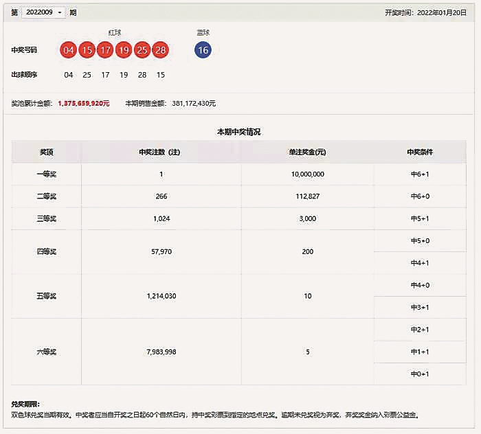 当期全国销量为3.81亿多元。计奖后,双色球奖池金额为13.75亿多元。