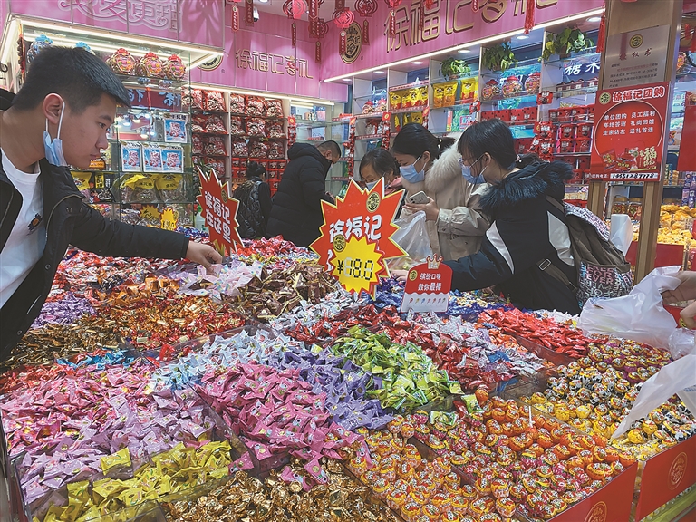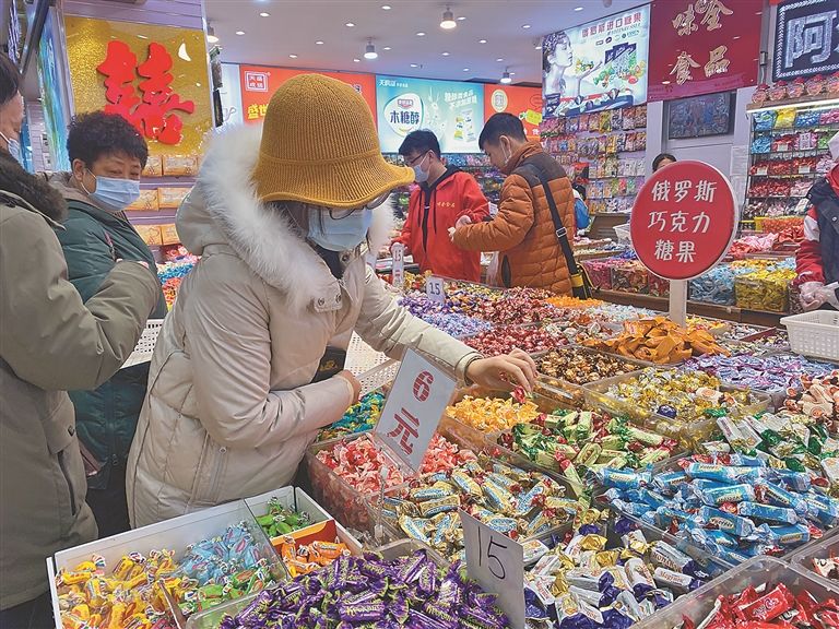 “满五十块钱,赠精美礼品。”记者此后来到道外区某批发商场,在电梯口就听见了吆喝声。记者看到店内在挑选糖果的顾客很多,大家手拿白色小筐,挑选着自己喜欢的糖果,光称重的顾客排队就要拐两个弯。“一走进市场,人潮涌动,这才感受到了年味儿。”一位顾客说道。