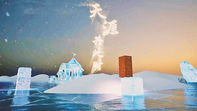 跟随着冰雕的美景,在“天涯共此时”金色文字牵引下,伴着纷飞的雪花,绕过靓影婆娑的冰面,观众仿佛身在既有浓郁欧陆风情又充满民族喜气的舞台,流光溢彩。