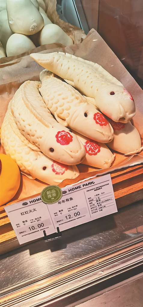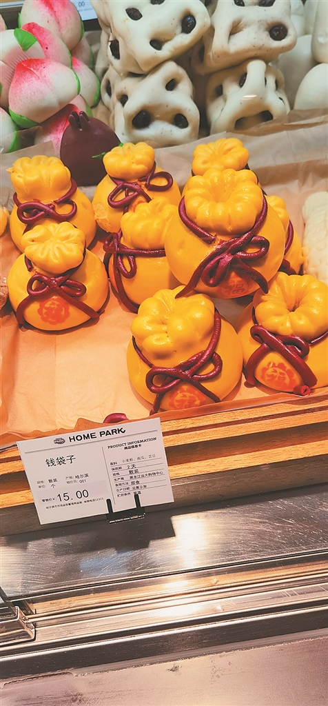 “钱袋子、福馒头、寿桃、招财进宝花饽饽。”生活报记者在道里区一家菜市场看到,面点区摆放着各式各样的面食,有小老虎、小刺猬、小熊图案的奶黄包,还有金黄色的“钱袋子”。