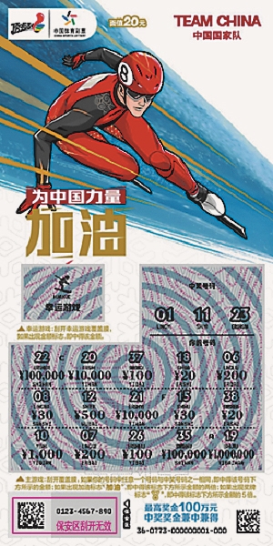 面值20元的“为中国力量加油 冰雪”即开票,共有16次中奖机会,最高奖金100万元。游戏玩法为数字匹配+找奖金符号。值得一提的是,该款即开票除了主游戏之外还设置了幸运游戏,为购彩者带来更多中奖机会。