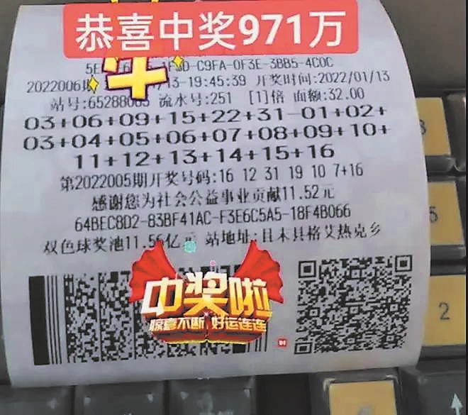 13日晚,双色球游戏2022006期开奖。新疆巴州中出1注一等奖,花落且末县65288063号福彩站。彩民毛先生(化名)机选投注了1注双色球蓝球复式6+16的号码,中得1注一等奖及15注二等奖,合计收获奖金971万元。17日,毛先生在自治区福彩中心领取了大奖。