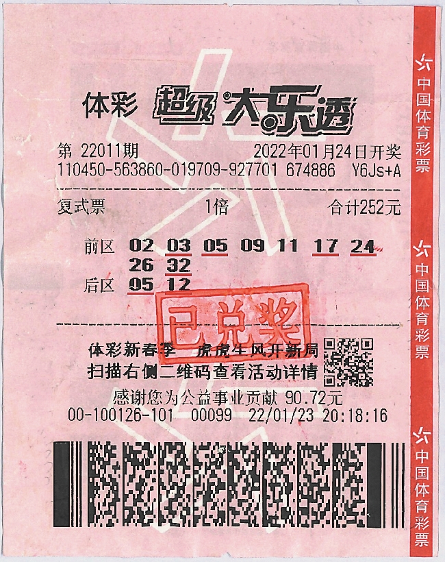 24日,体彩超级大乐透第22011期前区开出号码“03、05、17、24、32”,后区开出号码“05、12”。全国共开出5注一等奖,单注基本投注奖金1000万元。广西购彩者在本期开奖中收获1注一等奖,大奖出自南宁市。