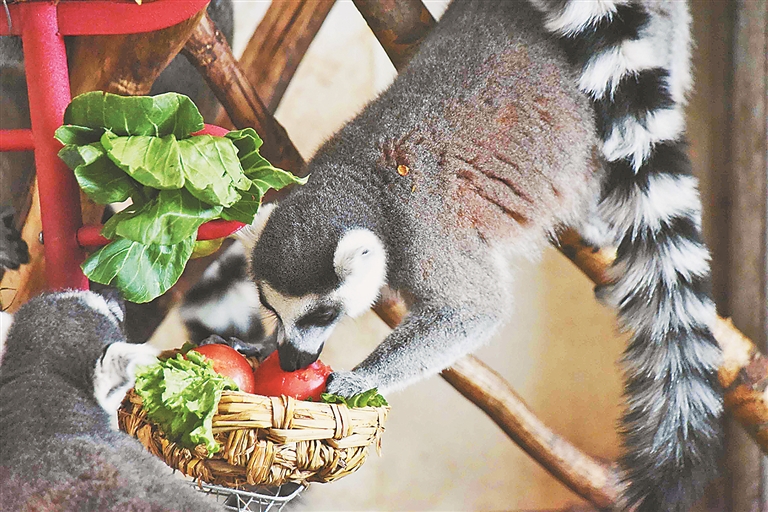动物园为环尾狐猴们准备的是名为“虎头虎脑”的春节主题自助餐。六层立体餐台上,摆放着虎头造型拼盘和水果、干果、蔬菜 、鸡蛋、面包虫以及六种口味的饺子。环尾狐猴们见到色彩丰富、琳琅满目的自助餐桌,一拥而上,大快朵颐。狐猴中最兴奋的当属小狐猴“强强”,初生牛犊不怕虎,它抱住最上方虎头造型的冷盘吃起来;稳重的“猴二姐”跷起脚来拿饺子;喜欢寻宝的“小花”在福袋里左掏右掏乐在其中;双胞胎打配合,两“人”一起攀着架子找美食,吃到尾巴竖起来,环尾狐猴的自助餐好吃又好玩。