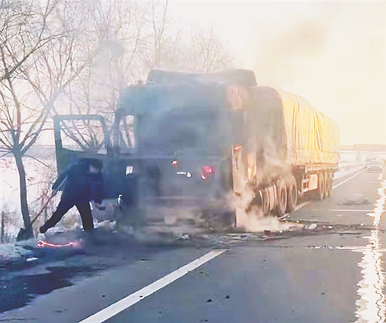 据了解,1月7日下午,在大广高速红岗段,一辆大货车突然起火,车身前部很快就被大火笼罩。就在大火向车辆中部蔓延快要烧到油箱时,有人看到一个身影在不停地挥动铁锹,用路边的积雪对油箱进行降温。这就是杨阔,此时油箱已经漏油,随时都有可能发生爆炸。