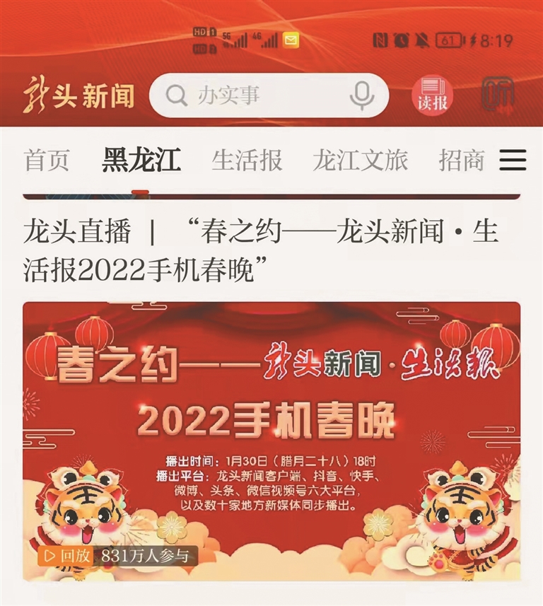 “整台晚会共吸引2000多万网友在线观看。其中,仅龙头新闻客户端观看人数就已达到831万人,聊天室更被2万余条弹幕不断刷屏。” 1月30日(腊月二十八)18时,以“相约春天 相拥美好”为主题的“春之约——龙头新闻·生活报2022手机春晚”,在龙头新闻客户端和黑龙江日报、生活报、老年日报所属抖音、快手、微博、头条、微信视频号官方账号,以及75家省内地方新媒体同步播出后,好评如潮。