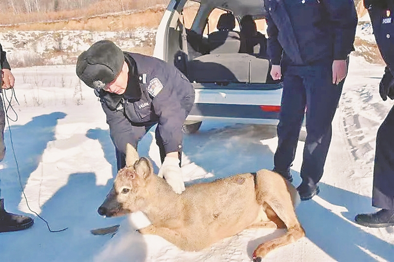 到达现场后,民警判断这是一只成年狍子。报警群众称和亲戚费了不少劲儿才把它抓住,为了防止其乱跑受到意外伤害,专门用绳子将其腿系住,然后立刻报警。经过仔细查验,森保大队民警确认狍子没有明显伤病。