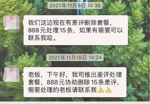 除了可以花钱刷好评,还可以付费删差评。武汉一家餐厅经营者李先生告诉记者,开业不久就有机构找上门来,表示可以帮助删除差评,“订购888元套餐,可以帮助处理15条差评。”