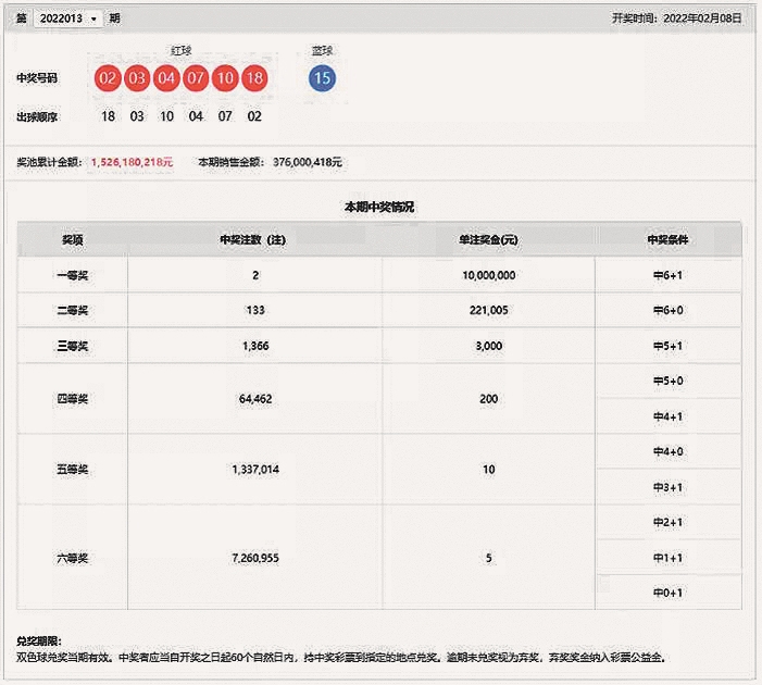 8日晚,中国福利彩票双色球游戏进行第2022013期开奖。当期双色球红球号码为02、03、04、07、10、18,蓝球号码为15。