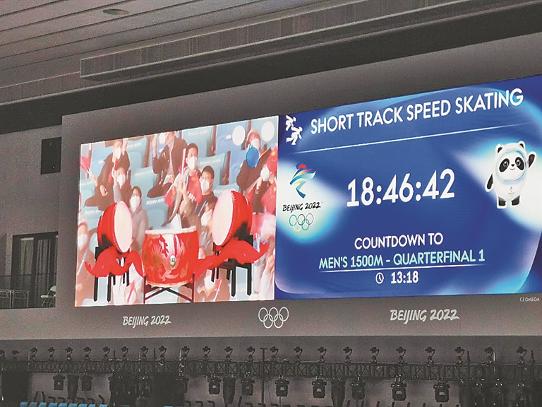 冬奥赛场上少不了“气氛组”的助力,在首都体育馆里,看台两侧各有一个大屏幕,比赛过程中用于播报比赛成绩。赛前,这里一半的屏幕会显示比赛项目和倒计时,另一半用来展示奥运精彩瞬间,有时也会让看台上的普通观众露露脸。