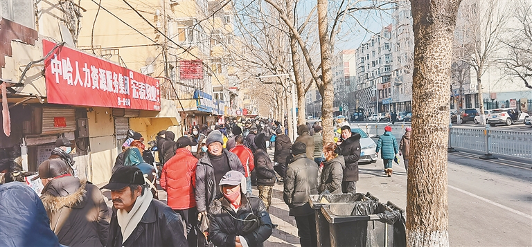 立春后的哈尔滨依然寒冷,但抚顺街上的劳务市场却是一派热闹景象,近200米的人流中,招聘者有的将招聘信息板立在板凳上,有的则直接挂在脖子上。众多务工人员在这段排满十余家人力资源公司的人行道上来回穿梭。