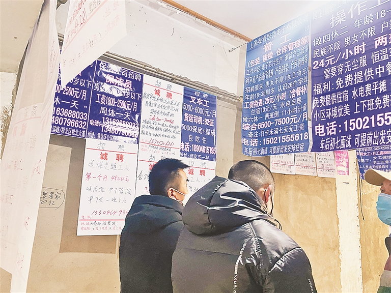 生活报讯 (实习生张瑞焓 记者梁晨文/摄) 俗话说“没出十五都是年”,往年这段时间务工人员还沉浸在与家人团聚的氛围中,因此各大用工单位或多或少都会感受到“用工荒”。但9日,生活报记者走访哈市抚顺街的劳务市场发现,今年春节小长假过后,务工人员早早返回哈尔滨,希望尽快找到合适的工作增加收入,用工单位也纷纷挂出招聘单,其中,餐饮、司机、制造等行业用工缺口较大。