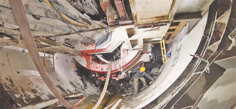“为保证盾构机成功穿越锚索区,项目部聘请专家,经过多次论证预加固处理措施、优化掘进参数、严控施工组织流程和应急保障措施。在盾构穿越前,提前对盾构机进行适应性改造,形成双轨迹线,确保能够全方位切除锚索,在地面采用高压旋喷桩对锚索进行固结,然后先破断后取出。同时,聘请第三方监测单位对施工完的既有隧道和地面进行实时监测,增加监测频次,确保施工安全。”单宇说,经过项目参建员工的共同努力,“五北区间右线”保质保量如期贯通,贯通穿越风险源沉降量均达到国家验收标准,最小处沉降值仅0.2毫米。