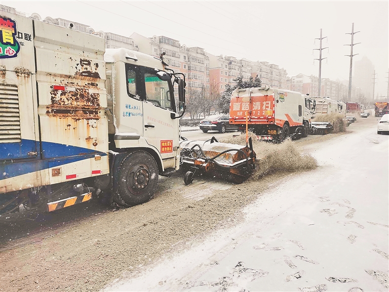 南岗区在降雪初期雪量不大的前提下,吹雪车先行上道,采取“打浮雪与清路面”相结合作业方式。滚刷车对主干道路、快速干道、坡路等重点区域街路路面进行打刷,清除街路浮雪,防止雪量加大,温度降低后路面结浮冰,清理难度加大。
