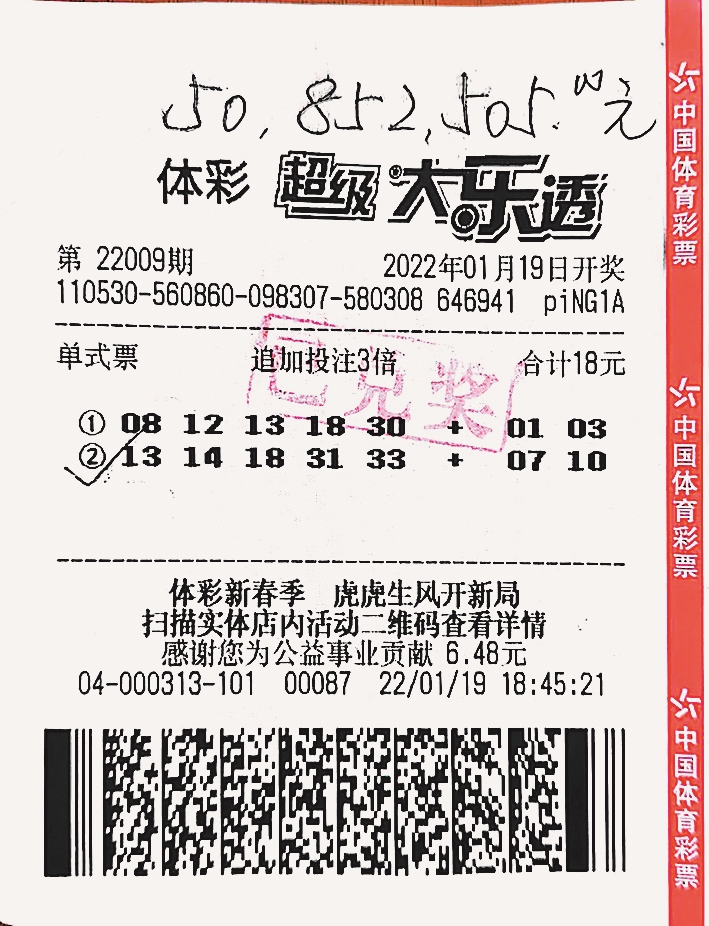 1月19日晚,体彩大乐透第22009期开奖,当期全国共开出6注一等奖,其中4注为1695万元(含753万元追加奖金)追加投注一等奖,落户云南昆明(3注)、辽宁鞍山。2注为941万元基本投注一等奖,花落黑龙江鸡西、云南昆明。数据显示,当期云南昆明的3注追加头奖系一人独中,而这注大奖,就产生在这张小小的18元、投注了2注号码、追加3倍的大乐透彩票上。