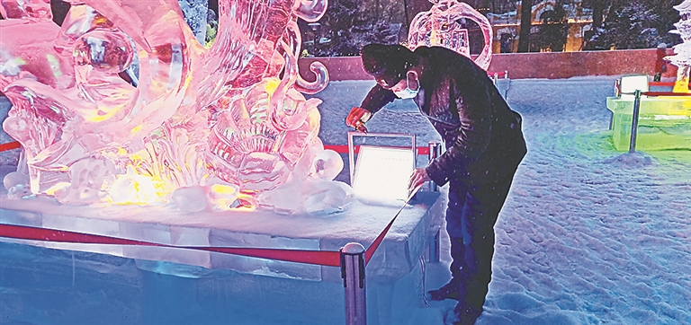 赵福仁师傅是兆麟公园的冰景和雪景维修师,他每天的工作就是巡查冰景雪景,并及时进行清理和修补。“其实游客素质都很高,不会有什么破坏,每天我就是盯着点。但是前两天天气有点回暖,那时候我就得很注意了,怕发生事故,也要及时维护,保证展出。”赵师傅说:“像这种天气,我就要及时清理冰景上的雪,要不然影响展出效果,尤其是晚上亮灯的时候。”