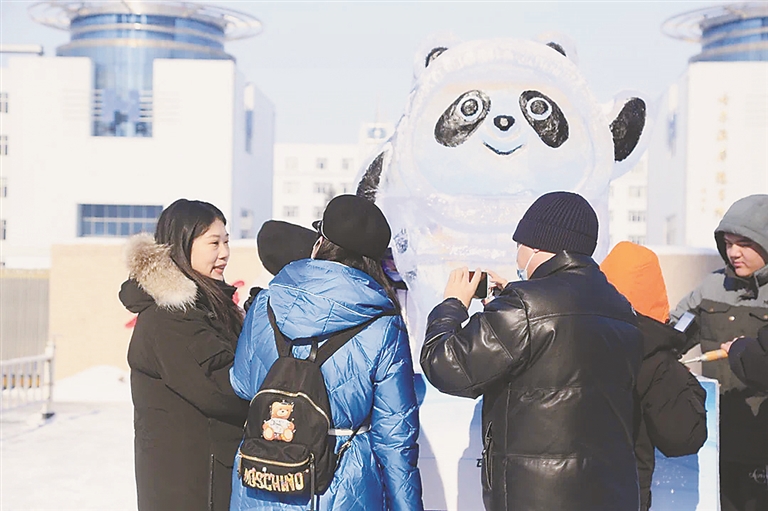 虽然现在还是寒假期间,哈尔滨华德学院艺术与传媒学院的师生却忙碌了起来,他们一边关注冬奥赛事,为中国健儿加油,一边组织大家行动起来,开展冬奥会吉祥物“冰墩墩”的冰雕创作实践。华德师生用自己的专业所长表达、展示对冬奥会的支持和激动心情,在校门口制作了一座“冰墩墩”冰雕为冬奥加油助力,更让“冰墩墩”成为哈尔滨新区大学城内一道靓丽的景观,引来许多过往市民驻足观赏留影。