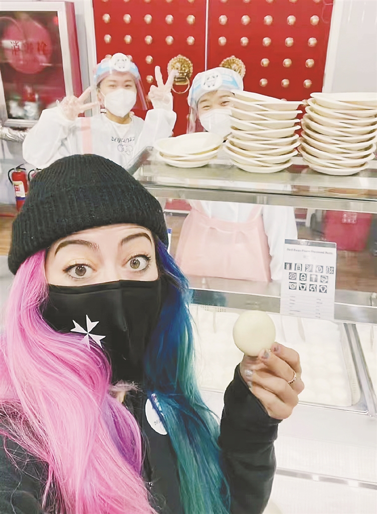 近日,在张家口冬奥村,珍妮斯接受记者采访时还不忘从衣服兜里,掏出早餐留下的两个豆包,赶紧咬上一口。“我第一天来就吃到豆包,然后意识到每顿饭都有,所以早中晚三顿饭都会吃。”等待成绩、接受采访都不忘吃豆包的珍妮斯竟然表示,自己最爱的中国小吃不是豆包。珍妮斯说:“我最喜欢的中国小吃是芝麻球,油炸的,很有嚼劲,外面是芝麻,里面是豆沙,我可以吃100个。”