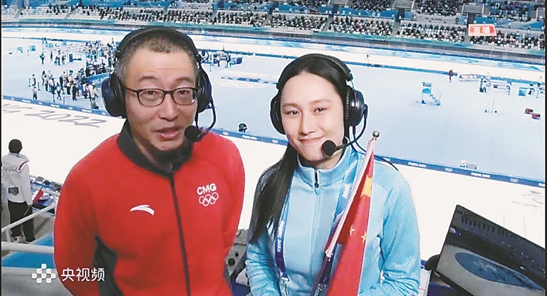 张虹(右)担任央视解说嘉宾 图片由哈工大提供