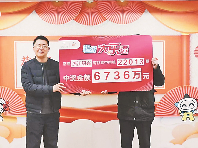 生活报讯 (一辰) 2月9日,体彩大乐透22013期开奖,本期开奖号码为:前区04、09、16、25、32 ,后区05、06。当期全国中出11注一等奖,其中,浙江绍兴购彩者揽获追加一等奖5注,单票总奖金6736万元。11日上午,中奖者马先生(化姓)和爱人王女士(化姓)一起来到浙江省体育彩票管理中心领奖。